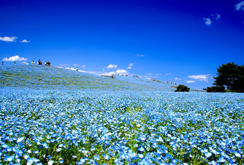 Nemophila có cánh hoa nhỏ màu xanh và còn có tên gọi khác là hoa tình yêu hoặc đôi mắt xanh của bé. Vào cuối tháng 4 đến đầu tháng 5, đồi Miharashi-no-oka của công viên Hitachi được bao phủ bởi 4,5 triệu bông hoa màu xanh tuyệt đẹp.