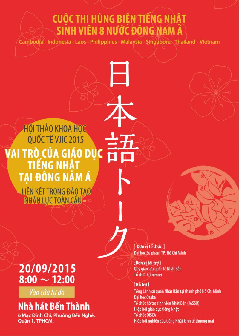 Được tài trợ bởi Quỹ giao lưu quốc tế Nhật Bản và tổ chức Kamenori, và sự hỗ trợ của Lãnh sự quán Nhật tại TP.HCM cùng nhiều tổ chức giáo dục khác, trường ĐH Sư phạm TP.HCM sẽ tổ chức Hội thảo Khoa học quốc tế VJIC 2015 với chủ đề "Vai trò của giáo dục tiếng Nhật tại Đông Nam Á - Liên kết trong đào tạo nhân lực toàn cầu".
