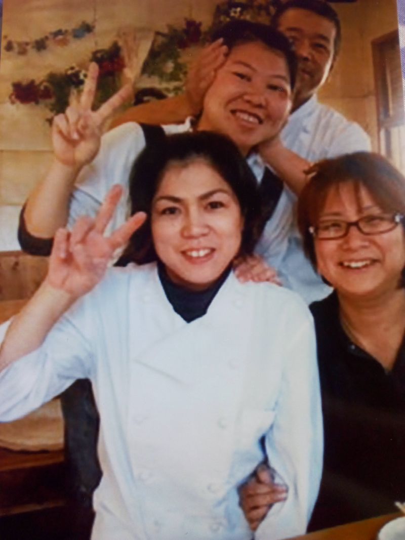 “Gia đình” của tôi tại Nhật: Ông chủ Takewaka (đứng) đang bịt tai trêu tôi, chị Takamoto ( mặc áo trắng) – người đã cứu tôi nhiều bàn thua trông thấy khi tôi dậy trễ không đi làm nổi vào những ngày mùa đông. Bên cạnh là chị Mizayaki, chị có hai con gái rất đáng yêu – hai bé là đồng minh của tôi và luôn viết thư khuyến khích tôi cố gắng học tốt. (Ảnh: Xuân Trinh)