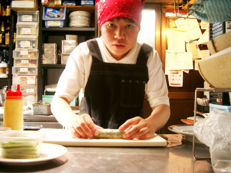 Tôi được chụp hình này và đưa lên menu của nhà hàng Hourai vì tôi giúp ông chủ sáng tạo ra món Harumaki (gỏi cuốn) theo phong cách Nhật. Món này sử dụng bánh tráng Việt Nam, rau xà lách, thanh cua, dưa leo, các loại rau củ khác và nước sốt đặc biệt của tiệm Hourai. Trong một thời gian dài, tiệm đã trở nên đông khách nhờ món ăn này. (Ảnh: Xuân Trinh)