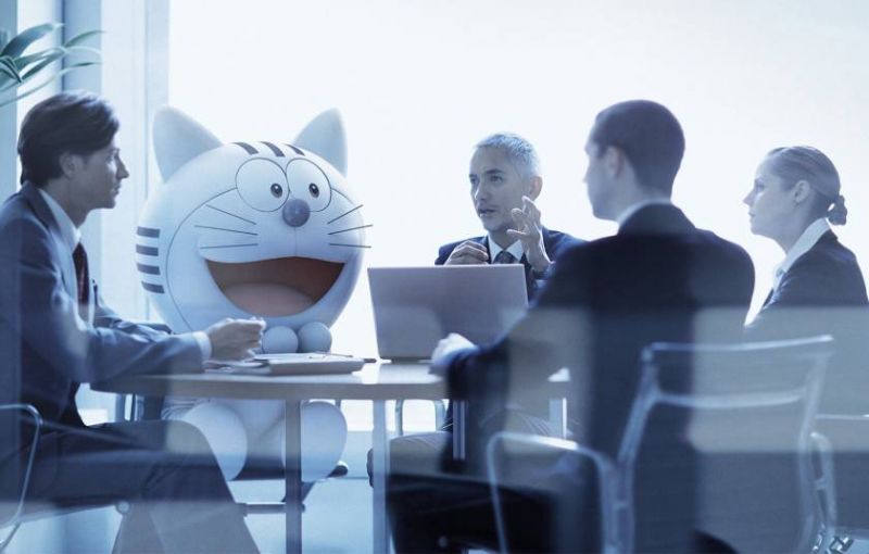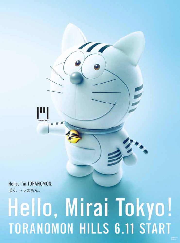Xét theo quan điểm thiết kế, bạn hãy nhìn kĩ vào logo của toà nhà Toranomon Hills: một hình 4 sọc đen đơn giản. Chính hình sọc này đã tạo ý tưởng để những nhà thiết kế biến Doraemon màu xanh da trời thành một chú mèo màu trắng sọc đen. Bên cạnh đó, Toranomon với từ 'Tora' có nghĩa là Tiger ở Nhật Bản và 'Mon' có nghĩa là cửa ngõ – rất phù hợp với hình ảnh một con hổ khá thân thiện đến từ tương lai bằng cánh cửa thần kì!
