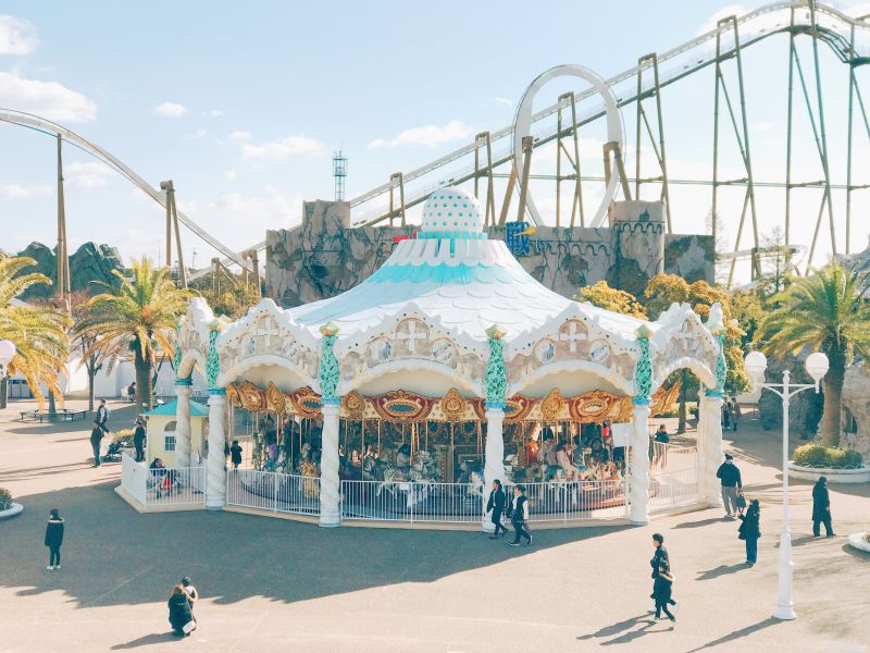 Vòng quay ngựa gỗ Gaudi Carousel và xa xa là tàu lượn Pyrenees (Ảnh: Bo Quỳnh Anh)