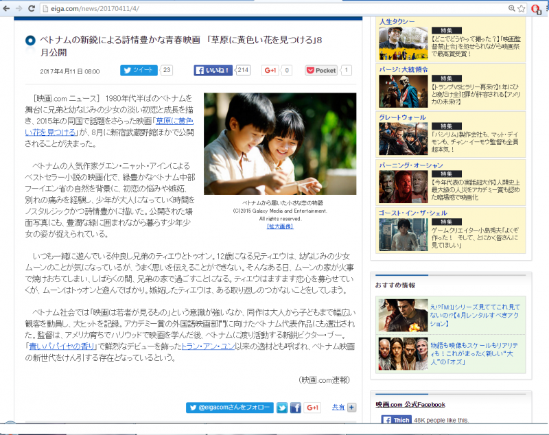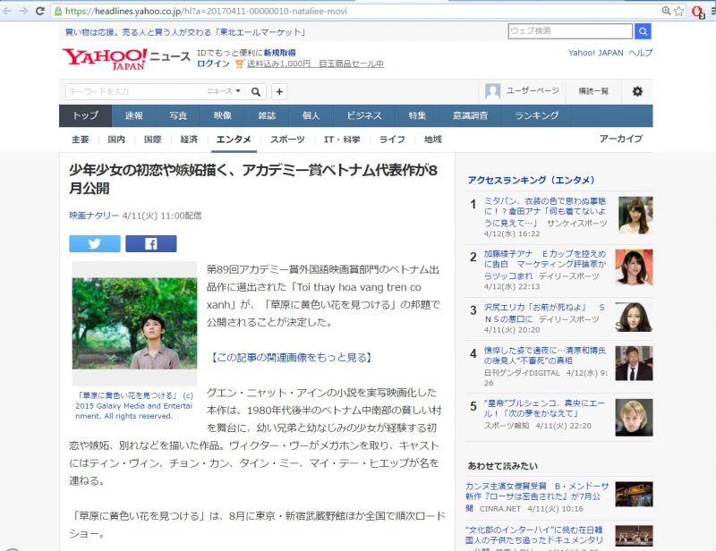 Rất nhiều báo mạng Nhật giới thiệu phim "Tôi thấy hoa vàng trên cỏ xanh".