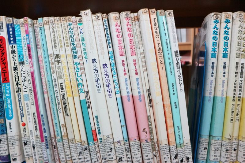 Hàng trăm cuốn sách với rất nhiều chủ đề khác nhau như bộ sách giáo trình “Minna no Nihongo” bản tiếng Nhật, “Shin Nihongo Kiso”, “Living Japanese”, “90 Days of Japanese Language Kanji Notes”. (Ảnh: Ngô Phương Thảo)