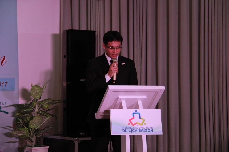 Không chỉ nói giỏi tiếng Việt, ông Takahashi Ayumi (Giám đốc Cơ quan xúc tiến Du lịch Nhật Bản tại Việt Nam (JNTO) còn vô cùng hài hước và thân thiện, giúp sinh viên hiểu thêm nhiều kiến thức về du lịch Nhật Bản. (Ảnh: Cao đẳng nghề Du lịch Sài Gòn).