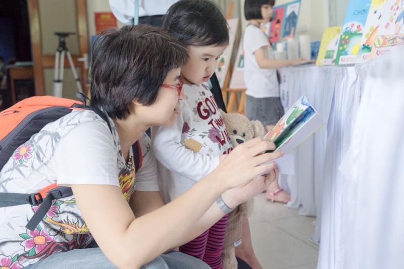 Một em nhỏ thích thú khi được mẹ đọc truyện.