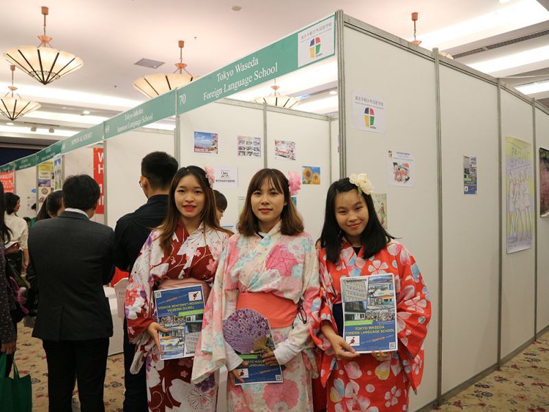 Ba bạn nữ duyên dáng "quảng cáo" cho booth của trường Tokyo Waseda Foreign Language School.