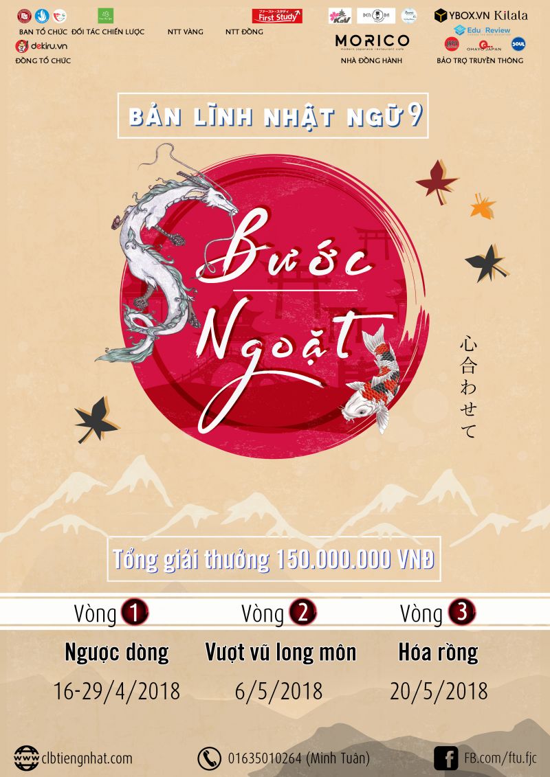Bạn mong muốn một sân chơi bổ ích để thử thách trình độ ngôn ngữ của bản thân và học hỏi thêm nhiều điều mới lạ? Cuộc thi "Bản lĩnh Nhật Ngữ 9" (BLNN9) do trường FJC - CLB Tiếng Nhật trường ĐH Ngoại thương kết hợp cùng Dekiru Nihongo tổ chức sẽ là một sân chơi bổ ích dành cho bạn!