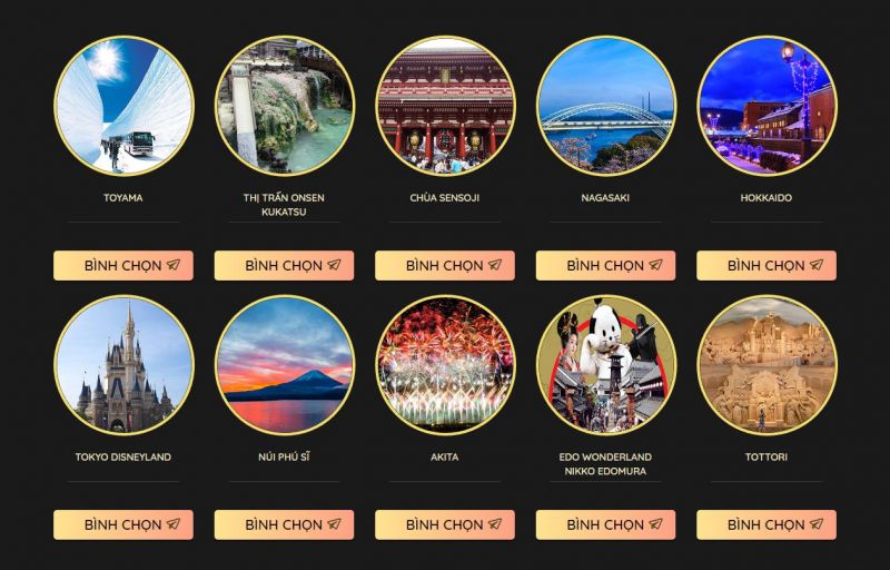 Top 10 điểm đến Nhật Bản được để cử gồm: Akita, Nagasaki, Toyama, Hokkaido, chùa Sensoji, núi Phú Sĩ, Tokyo Disneyland, thị trấn onsen Kukatsu, Tokyo Disneyland thì công viên Edo Wonderland Nikko Edomura vượt lên và có số lượt bình chọn cao nhất.